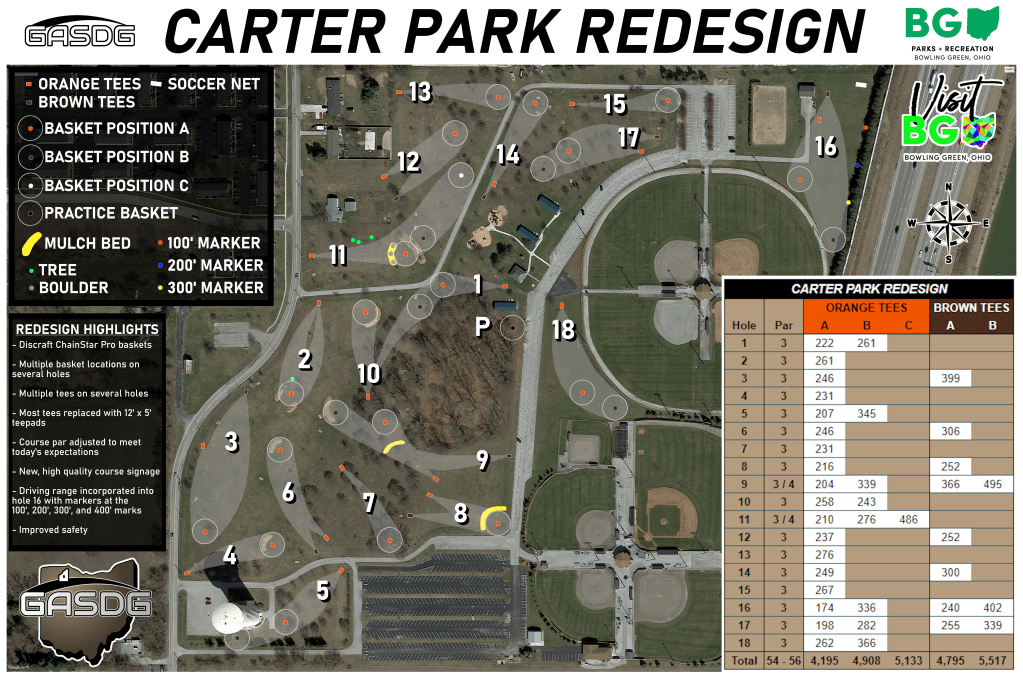 As many of you have noticed, the old course at Carter has been removed. Parks is working very diligently to get the new equipment and layout installed. We appreciate everyone’s patience during this progress, and like all of you we eagerly await its completion! To help ease the anticipation, we wanted to share the layout for the new and improved Carter Park! This layout was drafted, and voted on by the Carter Park Improvement subcommittee, so thanks again to everyone for their support and ideas!